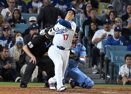 米大リーグのプレーオフは8日、地区シリーズが行われ、ナ・リーグ第3戦でドジャースはフィリーズに2―8で敗れた。大谷は1番指名打者で出場し、5打数無安打。写真は5回、三振に倒れた大谷=ロサンゼルス 【時事通信社】