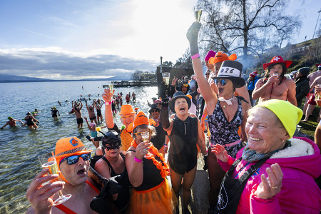 11日、スイス西部ニヨンのレマン湖畔で、ワイングラスを片手に水着姿で歓声を上げる人々。いてつく寒さのこの時期に湖を泳ぐ人々をたたえる恒例行事が今年も開かれた。 【EPA時事】