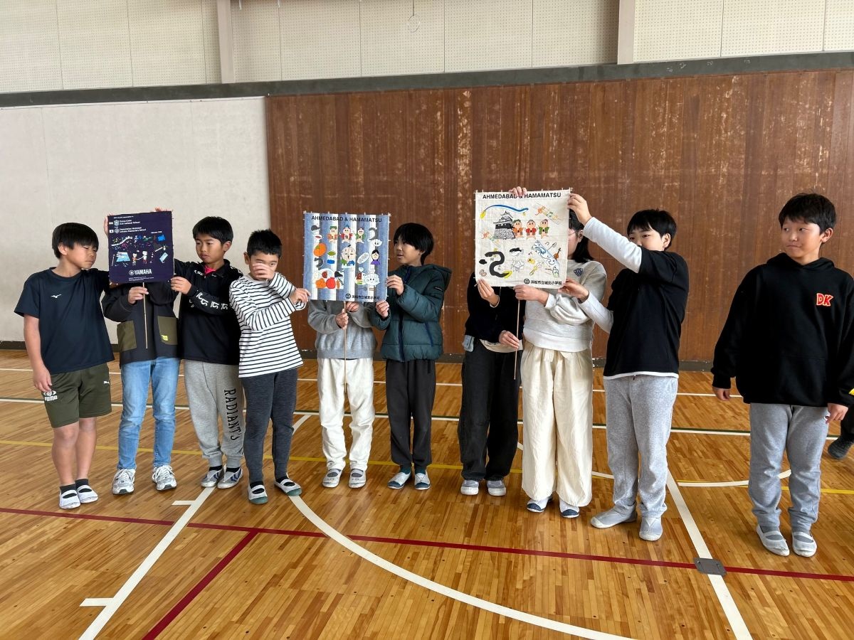 浜松市立城北小(浜松市中央区住吉1)の児童がデザインし、遠州織物で制作したたこが完成し、12月22日に同校体育館でお披露目式が行われた。