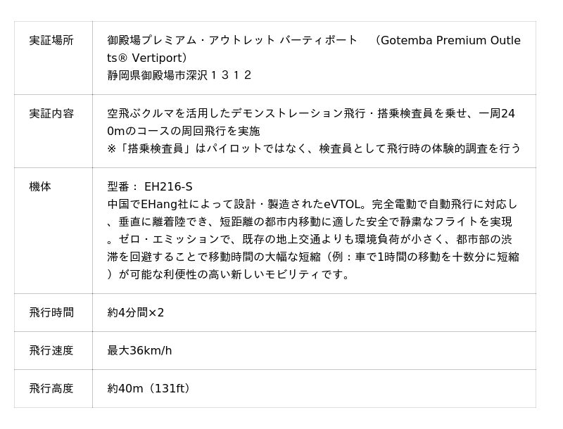 本デモフライトは、2025年5月に竣工した「バーティポート整備指針」(令和5年12月 国土交通省航空局)を参考にして整備した東日本初(※1)のバーティポートである「御殿場プレミアム・アウトレット バーティポート」を活用、国土交通省「令和6年度 バーティポート計画ガイドライン(仮称)の策定に向けた実証事業」の一環として行ったものです。