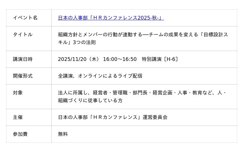 今回の講演では、こうした課題を突破するための「目標設計スキル」を“3つの法則”として整理し、具体的にどう実践に落とし込めるのかをお話しします。制度や評価の仕組みだけでは届かない、“明日から現場で試せる”アプローチを持ち帰っていただけるはずです。