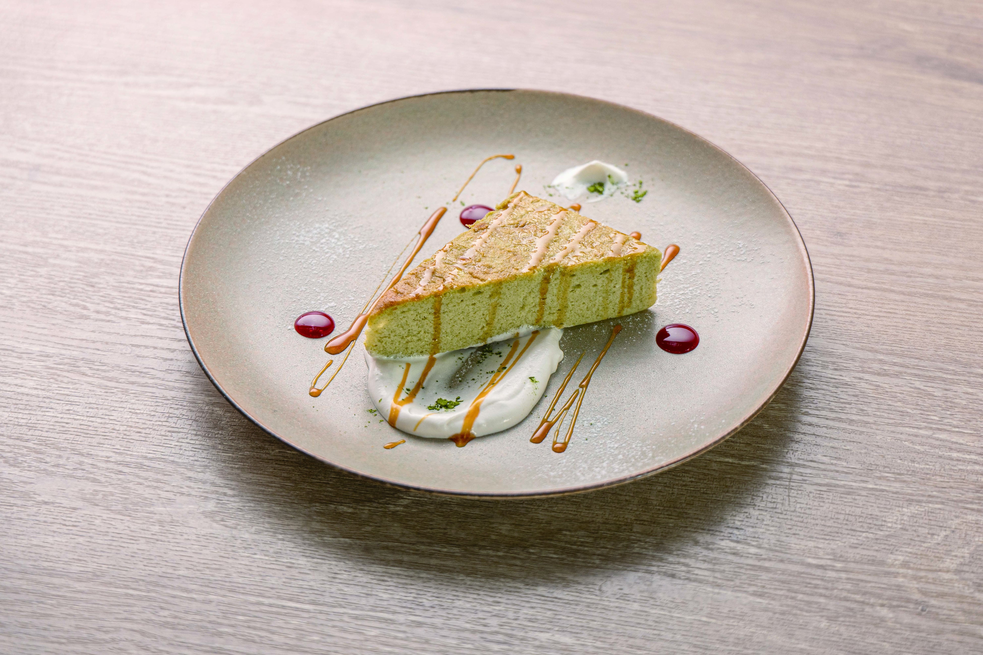 今回は静岡県産煎茶を使ったスフレチーズケーキを新メニューとして開発しました。最初はそのまま煎茶の風味を感じていただき、紅茶のクリーム、フランボワーズやキャラメルのソースで味の変化をお楽しみいただけます。ふんわり焼き上げたくちどけの良さは食後のデザートにもぴったり。香り高い煎茶と優しい甘みが贅沢な一皿です。年内いっぱいまで、レストラン「Cassolo」で販売しています(税込880円)。