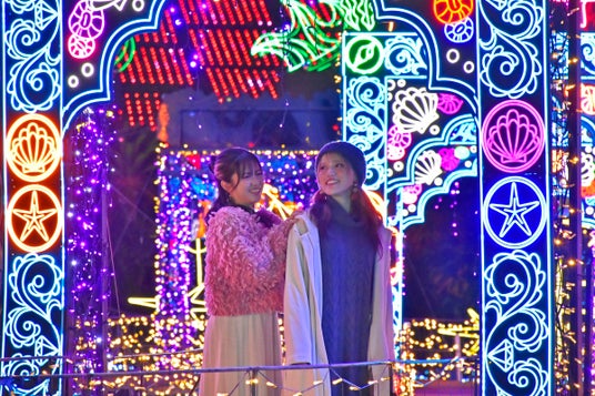 ウォークオンザイルミ  今シーズンもネオンで海のモチーフを描いたアーチが出現。リバーシブルに楽しめる。