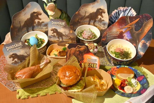 メニューは、ハンバーガー「T-REXバーガー」、「油そばウルス」、「トリケラタコス」はじめ、スーパーフードのアサイーを使ったデザート「ジュライー」、骨付きターキーに豪快にかぶりつく「ダイナレッグ」など、恐竜をイメージしたユニークなラインナップに一新。