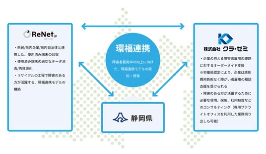 静岡県が障がい者雇用率向上に向けた啓発活動、リネットジャパンが環境分野、クラ・ゼミが福祉分野を担うことで、地産地消型の環福連携を実現します。