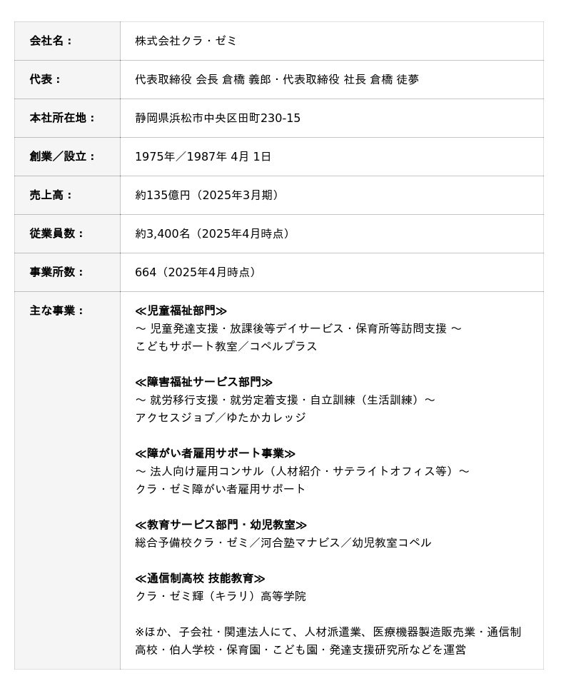 全国550の児童発達支援事業所をはじめとする、教育・福祉事業を展開する株式会社クラ・ゼミ(本社:静岡県浜松市、代表取締役:倉橋 義郎・倉橋 徒夢、以下クラ・ゼミ)は、リネットジャパンリサイクル株式会社(本社:愛知県大府市、代表取締役会長:黒田 武志、以下リネットジャパン)と共に事務局を務める『静岡環福連携促進協議会』を、本日2025年11月1日(土)に設立したことをお知らせいたします。