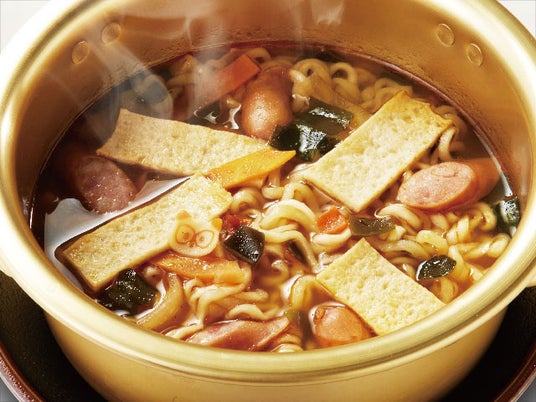 もちもちの太麺と海鮮ベースのスープで人気の「ノグリラーメン」。辛さ抑えめのマイルドタイプは、お子様でも食べやすい味になっています。貝・いか・えび・マグロなど、たくさんの海鮮でだしをとった、さっぱりした味をウインナーや韓国おでんのトッピングと共にお楽しみください。ちなみに「ノグリ」は韓国語でたぬきの意味です。