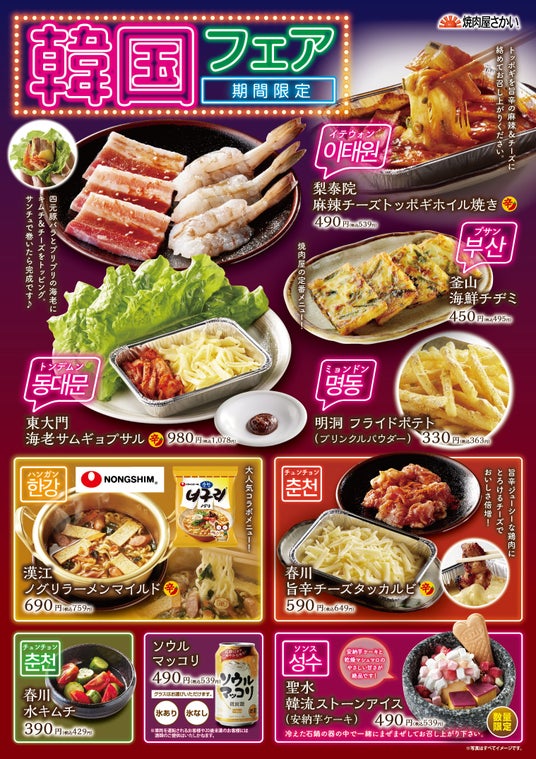 職人の手切りによる最高の状態でお肉を提供する「焼肉屋さかい」では11月5日(水)より期間限定で「韓国フェア」を開催いたします。麻辣チーズトッポギホイルなどの旨辛メニューに、韓国のZ世代に人気の「プリンクルパウダー」を使用したフライドポテト、そして コラボメニュー・本場で人気の「ノグリラーメンマイルド」など10種類のメニューをご用意させていただきました。気温が下がり始め、温かく、旨辛メニューが恋しくなる季節にぴったりのおいしさを揃えました。この機会に是非、お楽しみください。皆様のご来店をスタッフ一同お待ちしております。