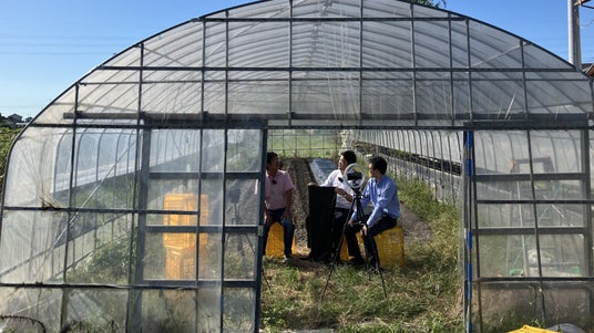 秋晴れのなか、ビニールハウスの中で撮影しました。