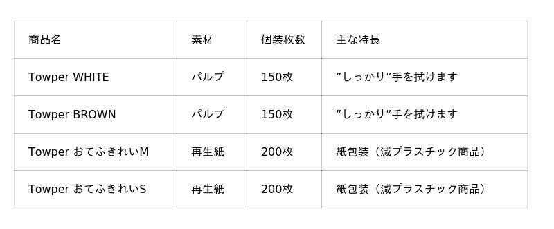特種東海製紙グループの株式会社トライフ(住所:静岡県島田市横井1-1-1、代表取締役社長:宮尾圭一)は、ペーパータオルブランド『Towper』(タウパー)から、4つの新商品を10月20日(月)に発売致しました。1972年、タウパーブランドのペーパータオルを発売して以来、業務用業界において、確かな品質・使い心地が評価され現在に至ります。この度、このプロ仕様のペーパータオルをご家庭にもお届けすることになりました。