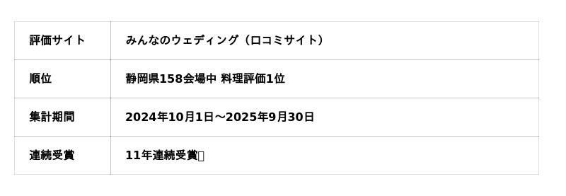 株式会社スティルアン(本社:静岡県浜松市中央区、代表取締役:石川学)が運営する結婚式場「ミュゼ四ツ池」が、国内最大級のウェディング口コミサイト「みんなのウェディング」において、静岡県158会場中、料理評価1位を獲得いたしました(集計期間:2024年10月1日~2025年9月30日)。これで11年連続の受賞となります。