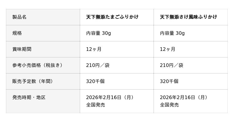 『天下無添ふりかけ』シリーズは、着色料・甘味料を使用せず、素材の風味を生かしたふりかけシリーズです。発売以来、製品コンセプトがお客様からご支持をいただいています。添加物不使用のふりかけ市場は拡大傾向です。今回は、ふりかけの王道フレーバーに注目し、ほんのり甘いたまごのおいしさの「天下無添 たまごふりかけ」と、味わい深いさけ風味の「天下無添 さけ風味ふりかけ」2種を発売します。