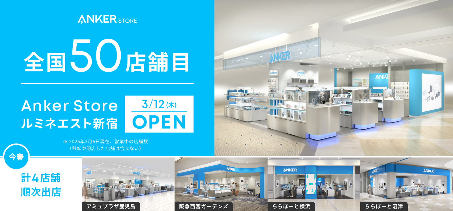 全国50店舗目となる常設直営店「Anker Store ルミネエスト新宿」を2026年3月12日(木)にオープン。新宿エリアに初出店するほか、2026年2月以降、鹿児島、西宮、横浜、沼津に計4店舗を順次オープンいたします。日本各地のお客様に製品をお手にとってご覧いただけるよう、最新製品を中心に幅広くラインナップしております。