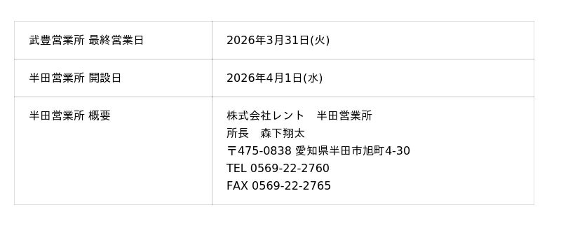 産業機械総合レンタル業、株式会社レント(静岡市駿河区、代表取締役社長:岡田朗)は、営業活動の拡大とサービス品質の向上を目的として、愛知県半田市に「半田営業所」を新設し、2026年4月1日より営業開始の運びとなりましたので、お知らせいたします。