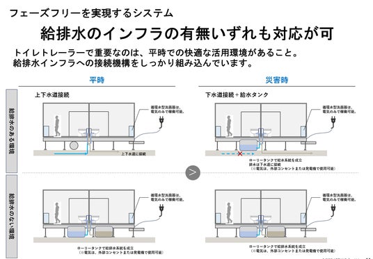 平常時は上下水道に接続して常設トイレとして利用し、災害時には簡易に給排水タンクの利用へと切り替えが可能です。