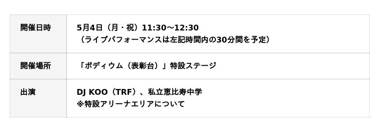 5月4日(月・祝)の決勝レーススタート直前「GWスペシャルライブ」を今年も開催します。出演はDJ KOO(TRF)と人気アイドルグループ私立恵比寿中学。両アーティストによる初の共演がサーキットで実現。「ポディウム(表彰台)特設ステージ」から、スタートを待つグランドスタンド全体を熱狂へと導きます。
