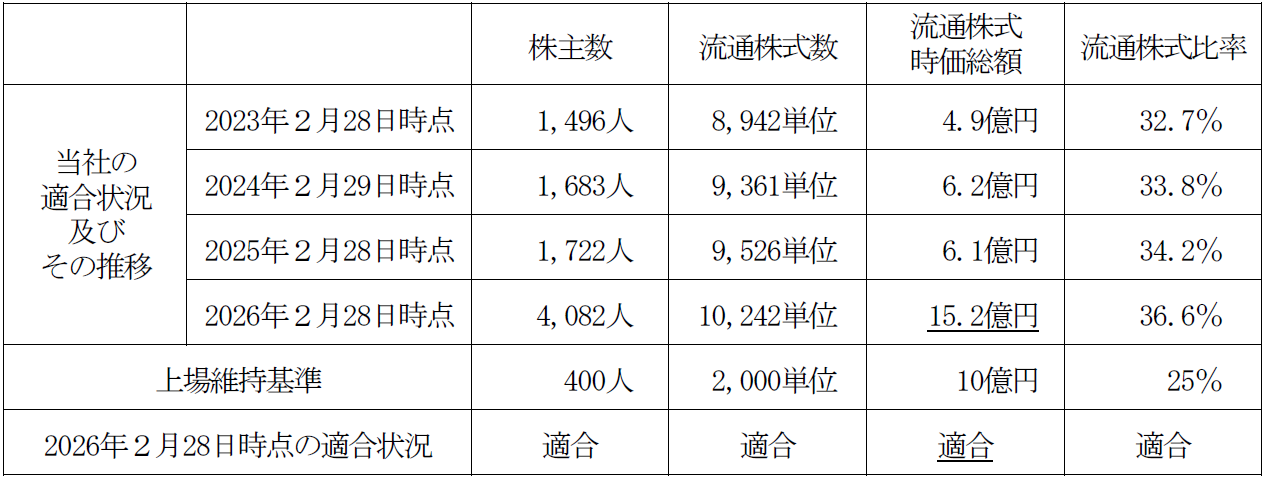 当社のスタンダード市場の上場維持基準への適合状況は、その推移を含め下表のとおりであります。2025年2月28日時点では、「流通株式時価総額」が適合しておりませんでしたが、上場維持基準への適合に向けた計画に基づき各種取組みを進めた結果、2026年2月28日時点において適合いたしました。これにより、スタンダード市場の上場維持基準の全ての項目に適合することとなりました。
