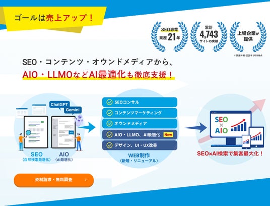 2005年の創業以来、20年以上にわたりGoogleのガイドラインに従った「ホワイトハットSEO」で培ったWebマーケティングの知見と実績を基盤に、累計4,673以上のWebサイトの検索エンジン最適化を行ってきました。そして、AI時代の情報探索の変化に対応すべく、AI最適化(AIO/LLMO)サービスを新たに展開。AIがコンテンツを深く理解し、生成AI搭載検索エンジンでも適切に評価・表示されるよう支援します。